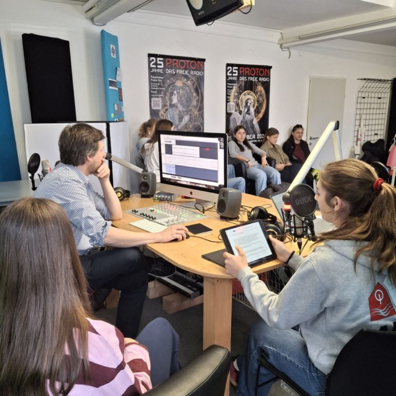 Die Schülerinnen und Schüler der Klasse 6o1 des Sportgymnasiums Dornbirn sind bei Radio Proton gewesen. Zuvor ist eine Radioschulung an der Schule vorausgegangen: Tina Strohmaier ist in die 6o1 gekommen und hat dort die Arbeit des Freien Radios vorgestellt und erklärt, wie eine Radiosendung aufgebaut ist. Es sind Aufgaben verteilt worden, bei denen die Schülerinnen und Schüler sogar gelernt haben, wie man mit Aufnahmegeräten umgeht und ein Interview führt. Zwei Wochen später sind entstandene Sendeteile im Studio zusammengeführt worden und mit Moderationen und Beiträgen, auch Musik, ergänzt worden. Es ist eine tolle Sendung entstanden!